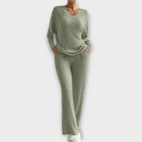 Erlebe Komfort und Eleganz auf eine ganz neue Weise mit diesem modernen Lounge-Set. Mit einem gerippten Design, einem V-Ausschnitt Langarmshirt und lockeren Hosen ist dieses Set perfekt für entspannte Stunden zu Hause oder für einen lässigen, stilvollen Look bei Ausflügen.